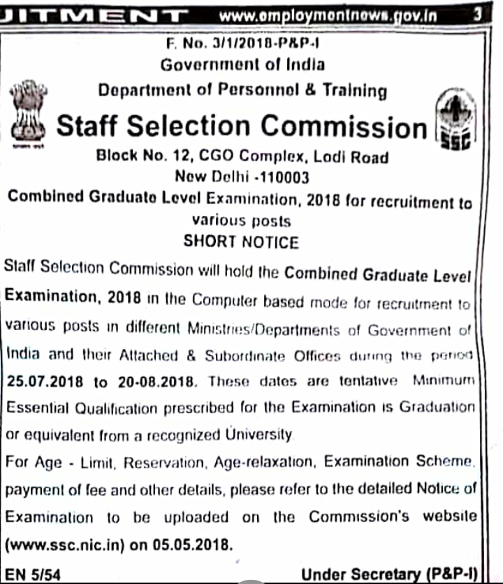 SSC (Staff Selection Commission) has published a short notice in the government employment news Patrika.